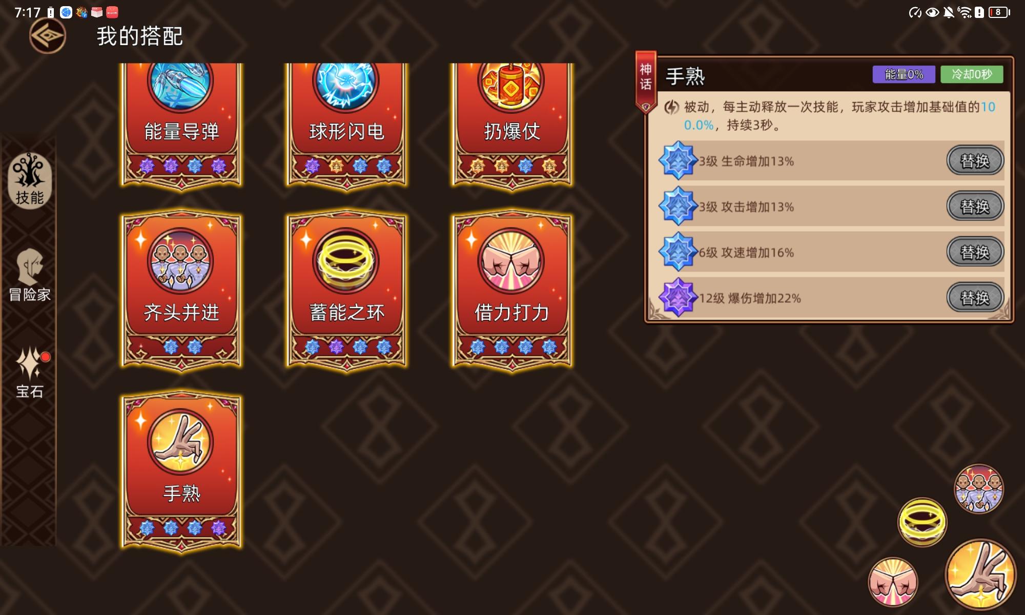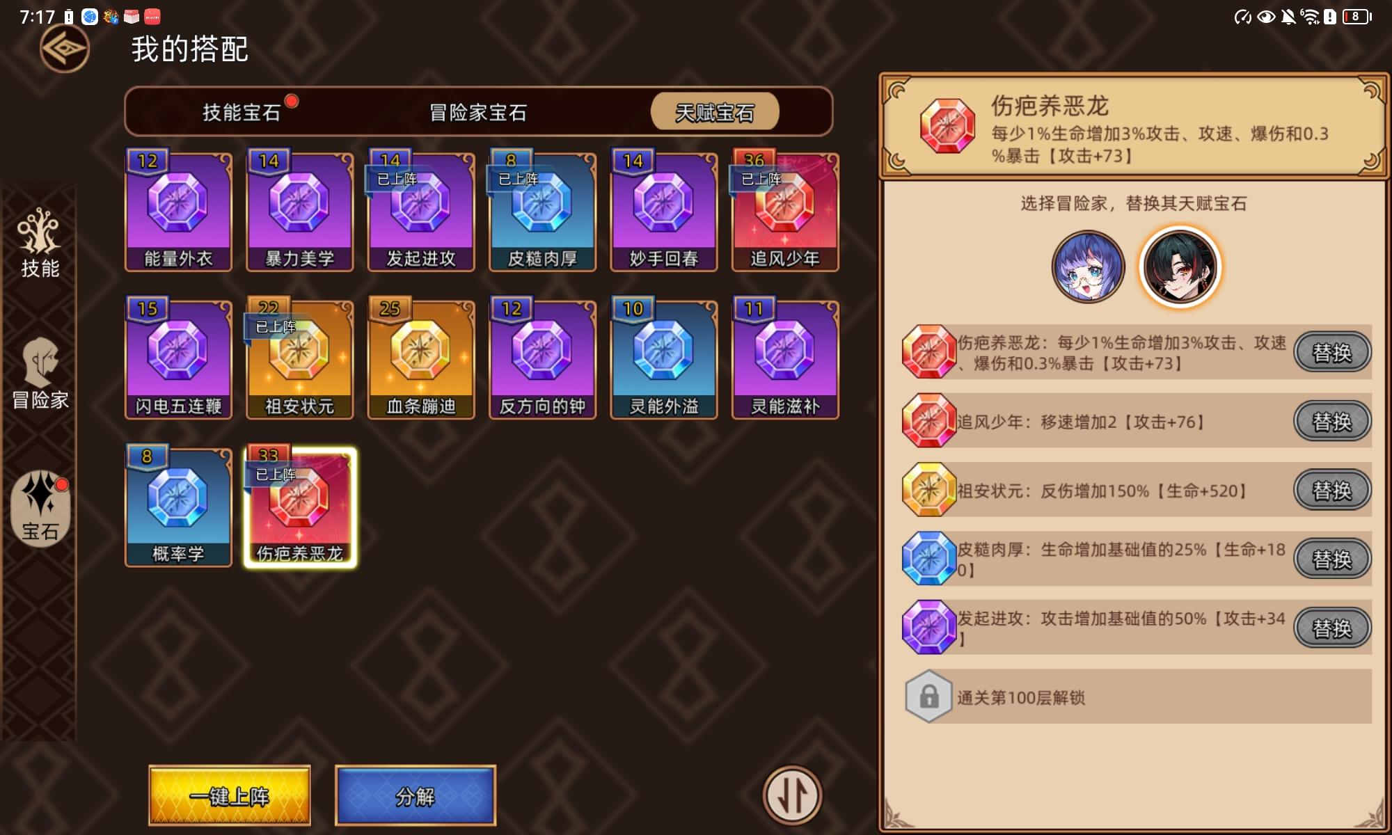 冒险家宝石看属性需求,可以自行选择。主要是需要普攻命中概率留下业火,业火可以快速清理小怪,打那些行动缓慢的boss速度更快。