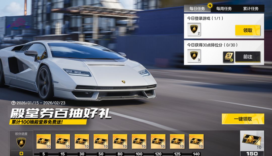 赛车手们完成每日、每周以及累计登录任务即可获取积分,达到一定积分目标即可解锁兰博基尼 Countach LPI 800-4专属殿堂寻宝券奖励。从登录签到到排位挑战,多重任务轻松参与,最高可赢取共计100张专属殿堂寻宝券,助力赛车手将这辆殿堂级传奇超跑收入囊中!