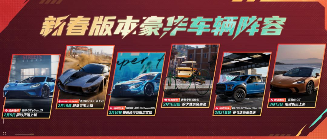 新版本新体验,全新豪车阵容:马年限定双组别殿堂赛车法拉利 FXX-K Evo以及福特 GT (Gen.2)、梅赛德斯-AMG C63 Coupe DTM、奔驰专利机动车、福特 F150 SVT Raptor(Gen.13)、迈凯伦 GT即将陆续登陆热湾。