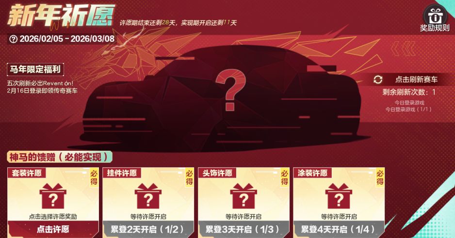 赛车手完成每日任务即可获取奖励刷新次数,刷新必定开出传奇赛车奖励,每次刷新后可自由选择保留当前奖励或替换,刷到心仪奖励时直接锁定准备收入囊中;同时参与活动完成4天登录任务,就能解锁专属许愿单并许下你的马年心愿!除夕过后心愿惊喜正式揭晓,心仪的传奇赛车、涂装、套装、头饰、挂件好礼通通抱走~