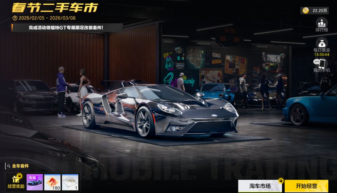 二手车交易活动再续新篇章,新增经营随机事件,参与活动买卖二手车赚取交易代币,累计交易代币到一定数量,可兑换福特 GT (Gen.2) 专属套件-天梦奖励。