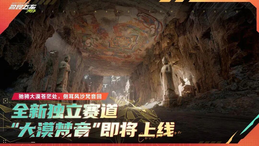 全新独立场景赛道“大漠梵音”2月5日正式上线!系好安全带,在大漠梵音中轰鸣引擎,驶入漫天黄沙,掠过峭壁古寺;洞窟中飞天壁画流转千年光华,千古梵音与引擎轰鸣碰撞交织,开启一场穿越沙海、神迹与未来的极速狂飙!
