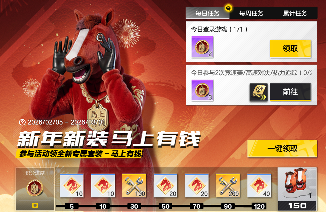 通过完成指定任务获取积分,积分达到一定数量,即可获得全新专属套装-马上有钱,2月16日(大年三十)当天登录还可领取配套动作-马年摇。