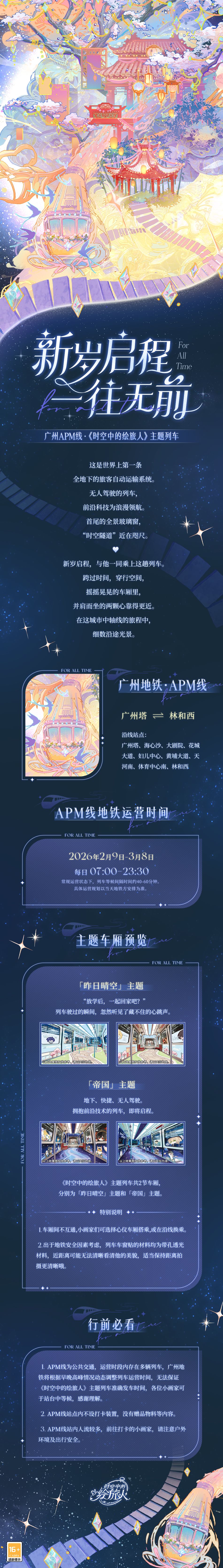 ※ 温馨提醒:APM线为公共交通,运营时段内存在多辆列车,主题列车为其中之一,广州地铁将根据运营情况动态调整每趟列车的运营时间,无法保证《时空中的绘旅人》主题列车的准确发车时间,感谢各位的谅解与支持!APM线站点内不设打卡装置,没有赠品物料等内容。APM线站内人流较多,前往打卡的小画家,请注意户外环境及出行安全。