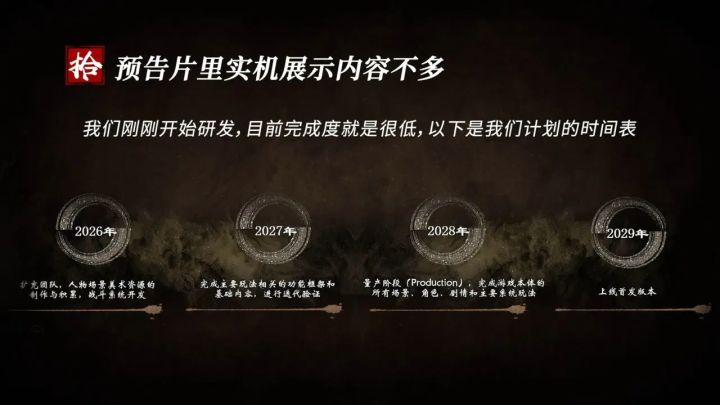 据悉,陈默在视频中坦诚分享了游戏的详细开发时间表,根据规划,2026年团队将重点扩建团队规模,主攻美术资源与战斗系统开发,到2027年团队将完成主要玩法相关的功能框架和基础内容2028年进入内容量产阶段,最终在2029年推出首发版本,这一相对漫长的开发周期与项目现状直接相关,美术制作组在2025年4月才重组并开始游戏制作,目前项目完成度非常低,甚至不足以支撑实机演示PV的制作![[TapTap表情|TapFamilyxdoro2_粉狗发射]](https://img.tapimg.com/market/images/934f58613a089b2e214eb0e0638bbbad.gif)
