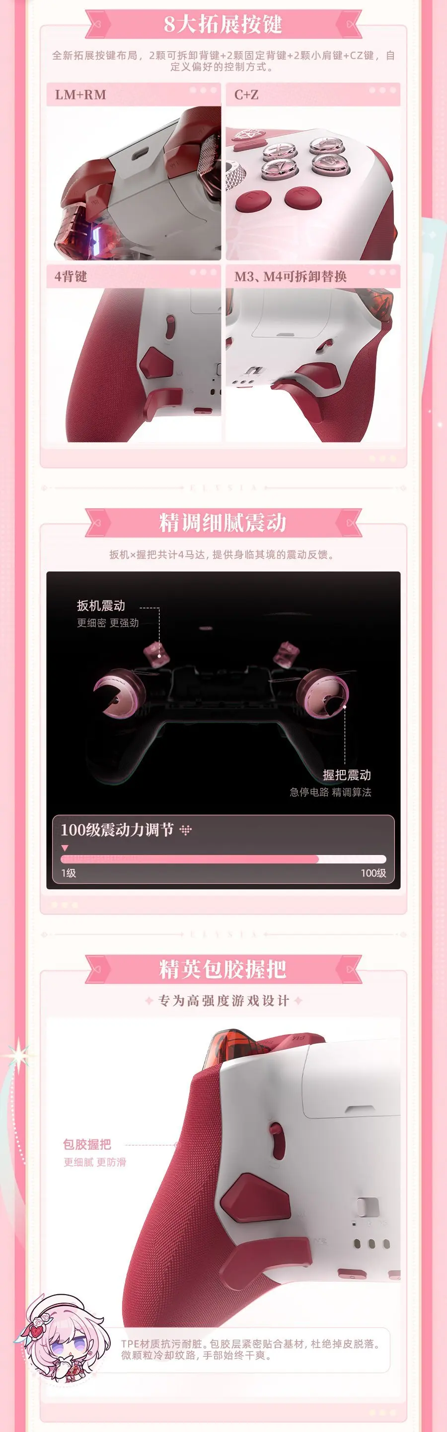 2月4日,米哈游官方宣布推出崩坏3人气角色爱莉希雅主题的竞技精英手柄,定于2月7日20:00在多平台开启预定,这款手柄以爱莉希雅标志性的渐变粉色系打造,融合了全链路低延迟技术与可定制化元素,满足了高强度游戏需求![[TapTap表情|TapFamilyxdoro2_粉狗比心]](https://img.tapimg.com/market/images/101c7e3200596fe8e03765080b467fb8.gif)