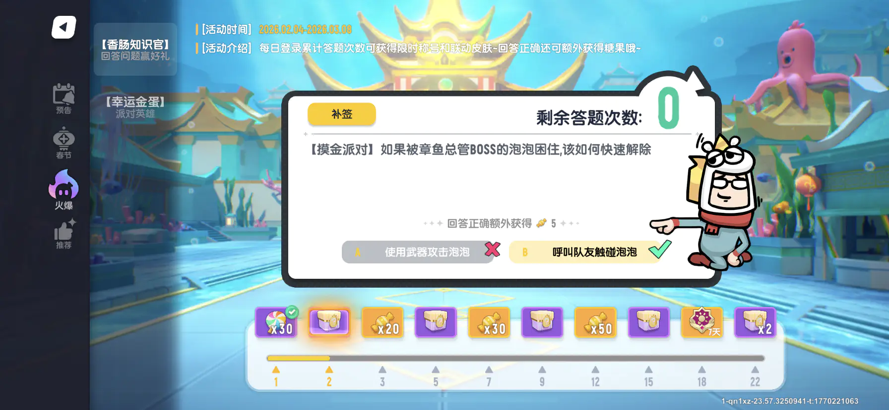 分析:章鱼总管的泡泡需要队友触碰或等待倒计时结束解除!