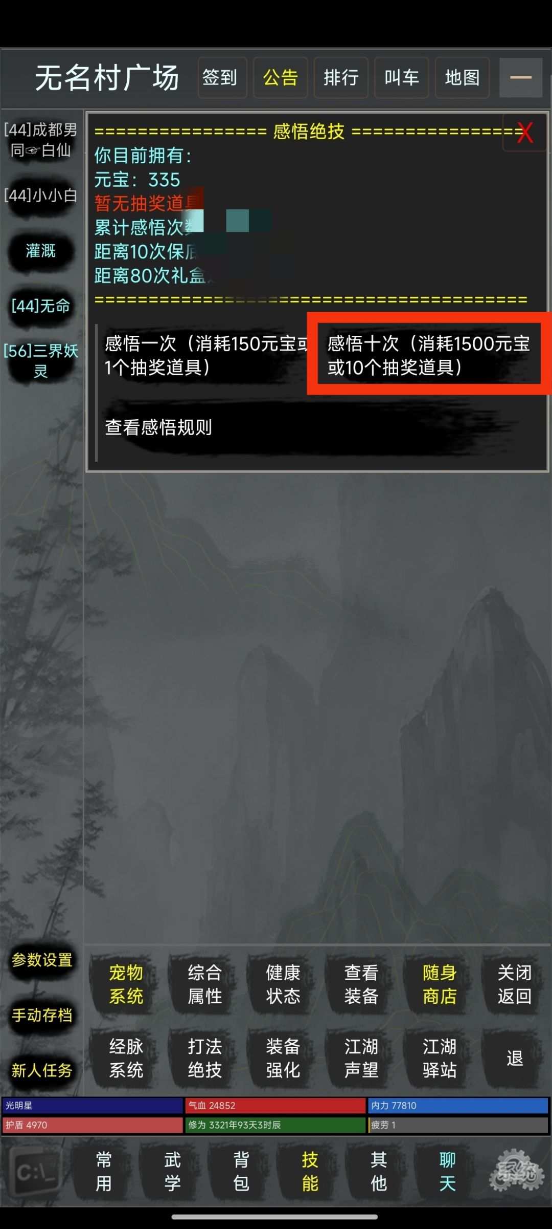 天书残页:在常用处-打法绝技-感悟绝技使用(打法绝技为主动使用技能,详情请看群里技能攻略及游戏内查看看其他-技能图鉴查看)