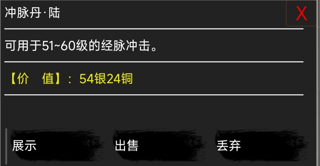 冲脉丹:用于冲脉升级,一共分为壹到陆,高级丹可低级服用,但低级丹不可高级使用。