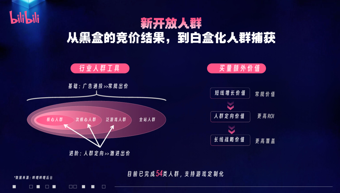 目前B站已经完成了54类人群建设,同时未来也会开放更多,并支持为客户进行定制化人群。