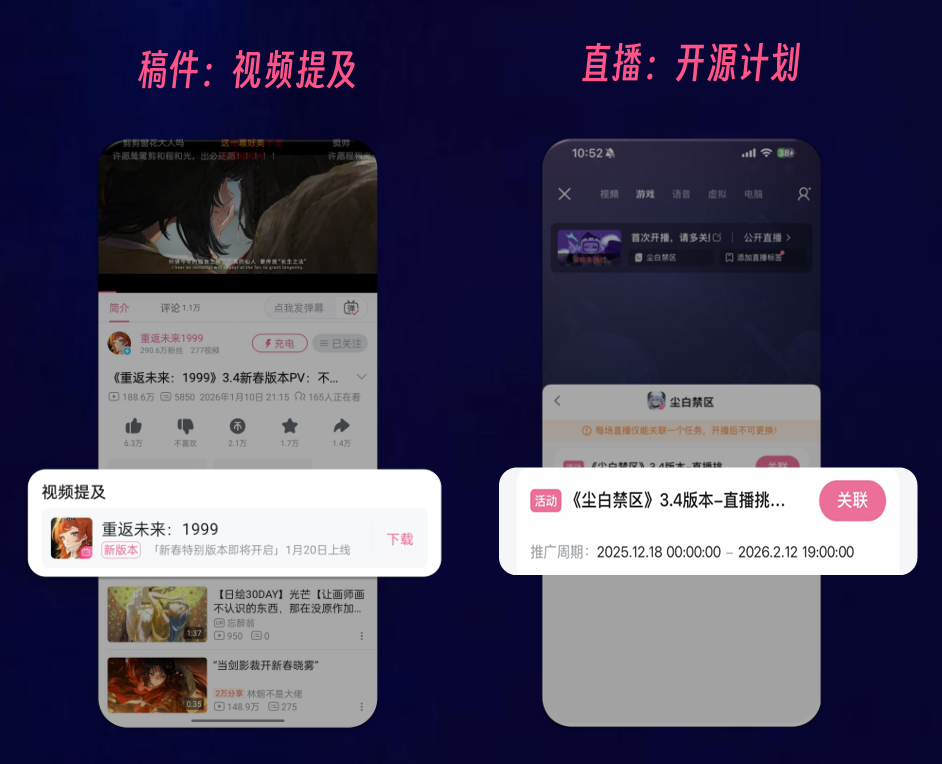 然而,过去只有不到1%的生态内容被用于商业投放,剩下的99%因为授权或技术原因被浪费。为此,B站推出了稿件视频体系和直播开源计划:平台通过算法自动识别稿件中的游戏内容,并挂载转化组件。