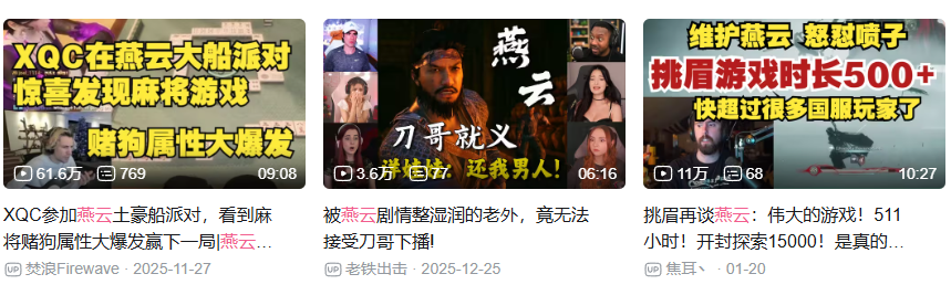 这种效果显而易见,在一些非游戏相关的历史视频中,你常常能刷到像“燕云玩家到此报到”这样的弹幕。这意味着游戏已经超越了产品本身,成为了一种文化符号。