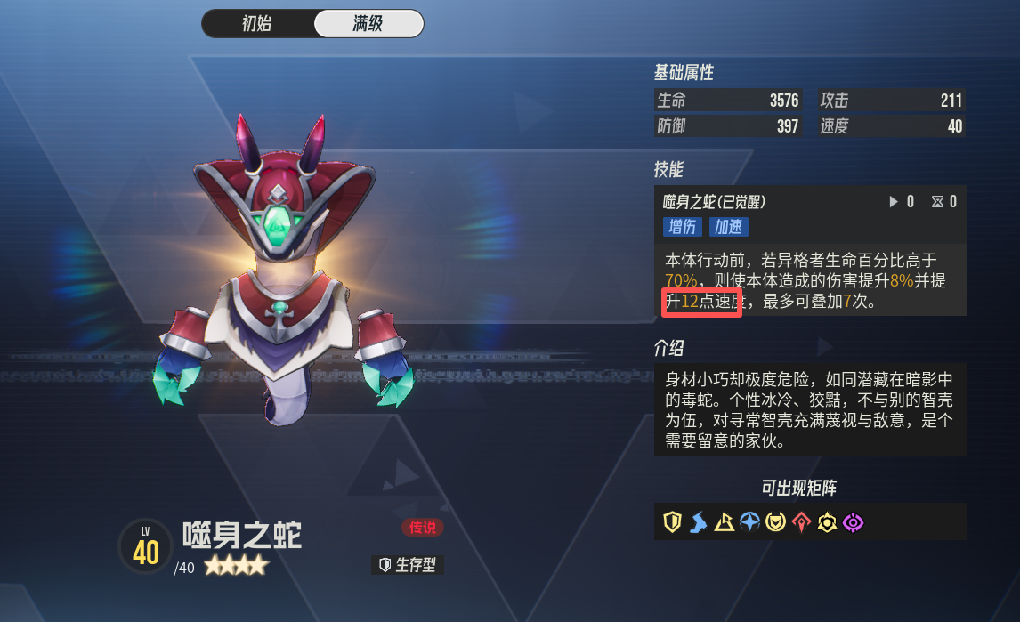 ▷本体行动前,若异格者生命百分比高于70%,则使本体造成的伤害提升8%并提升8→12点速度,最多可叠加7次。