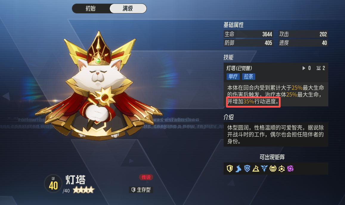 ▷本体在回合内受到累计大于25%最大生命值的伤害后触发,治疗本体25%最大生命,并增加25%→35%行动进度。