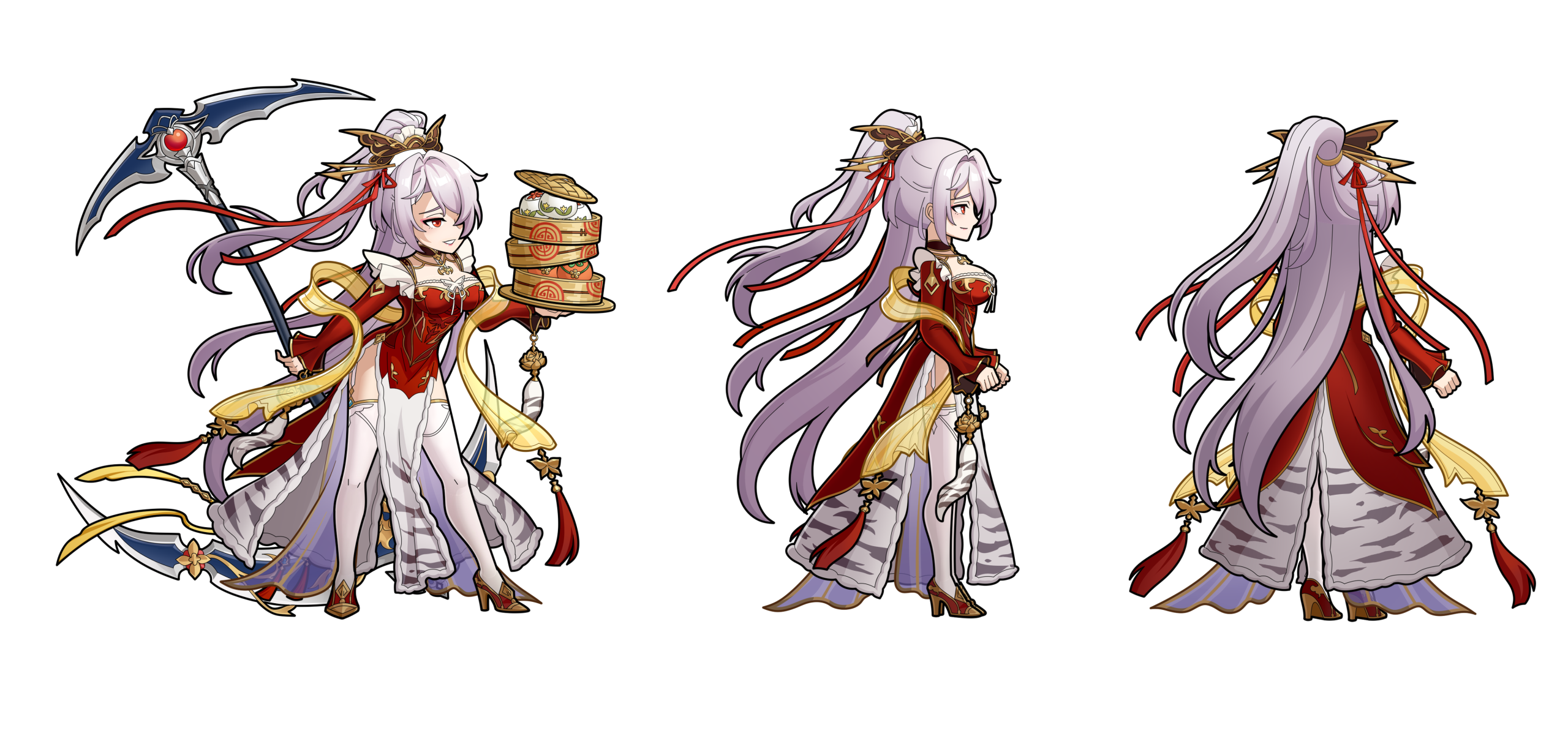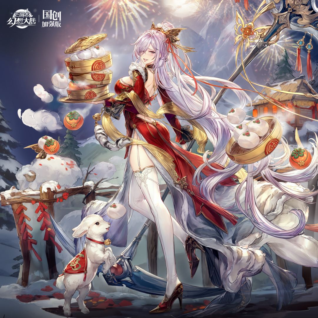皮肤以绛红色为主色调,结合典雅的新年旗袍设计,画面洋溢着浓郁的年节氛围。岁末时分,天地银装素裹,张春华穿着一身绛红旗袍新衣,明黄色的飘带环绕周身。她一手托着刚出笼的包子,一手拎着镶嵌红宝石的镰刀,在这难得的闲暇片刻,静静品味着弥足珍贵的温馨时光~