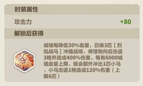 技能效果【烈焰战马】:城墙每降低一定血量,召唤3匹烈焰战马冲撞战场,将怪物击退3格并造成伤害。城墙血量上限提升,将额外冲出数匹小马,小马击退1格并造成伤害。