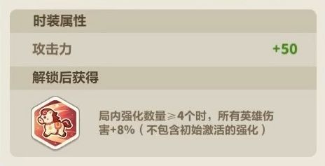 【跃马踏星】:局内强化数量达到一定数量时,所有英雄伤害增加。(不包含初始激活的强化)