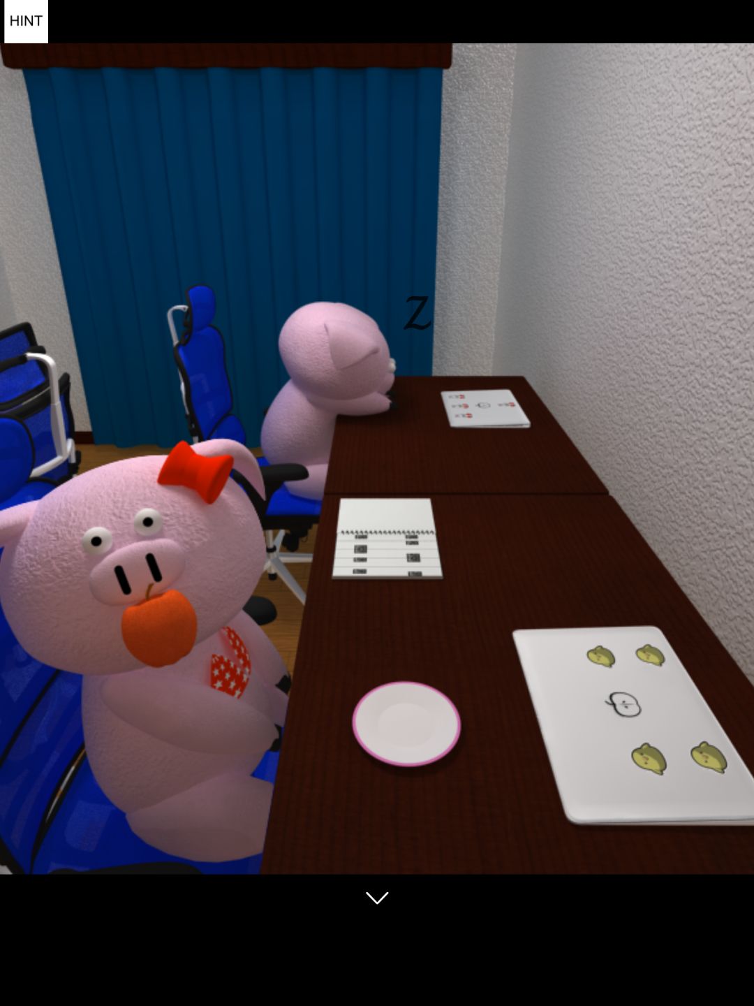 13、结合【白板区】厕纸上的图案以及椅子上的指示,可得顺序为右右左右左,这个是拍打睡觉小猪的顺序。回到【办公区】按照这个顺序拍打小猪,小猪惊醒。三只猪又开始努力工作了,游戏结束。