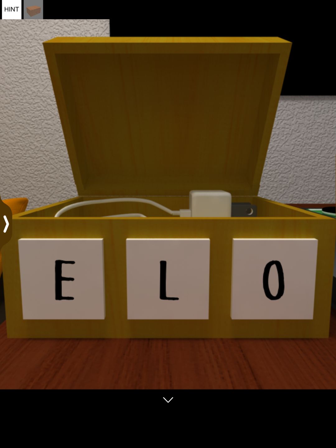 9、用板擦擦掉【白板区】白板上的黑色笔迹,可得达摩图案和指示箭头,对应的是【欢迎区】门上的字母,即为ELO,这是【休息区】黄色盒子上的密码,盒子打开后得到一个充电器。