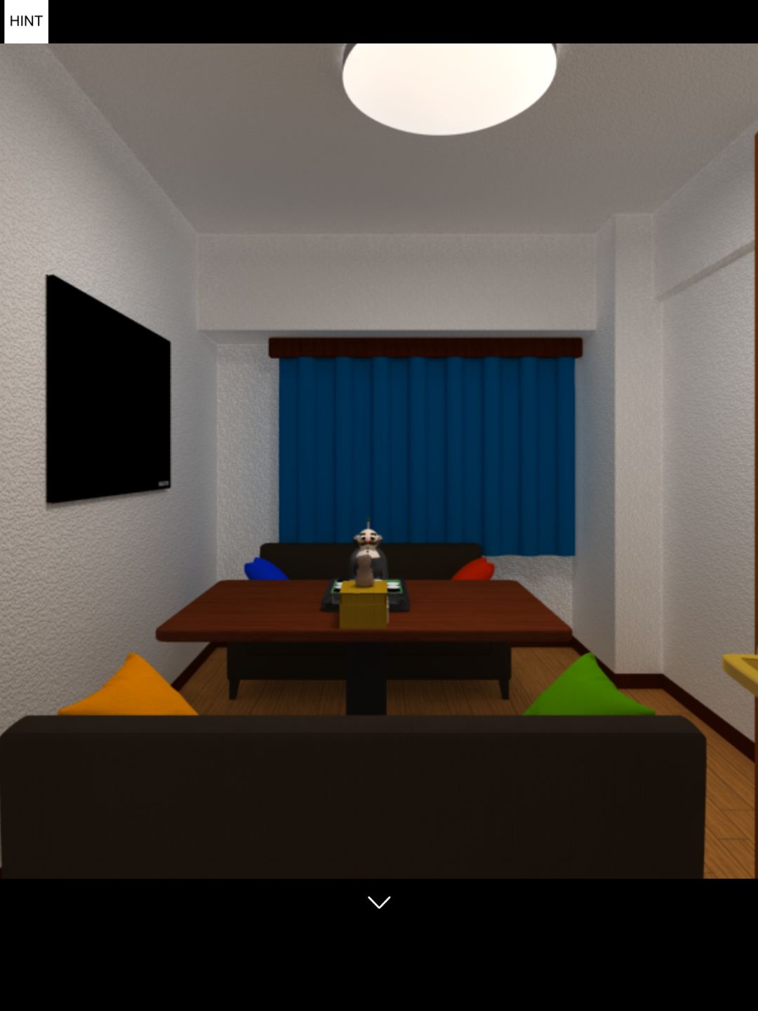 4、棋盘右边的玩偶标签上写的VICTORY,按照红蓝黄红黄蓝黄的顺序排列,这是【老虎区】右下角柜子的点按顺序,按顺序点击不同颜色,得到一个黑色小球,还能看到右边放了刀具。