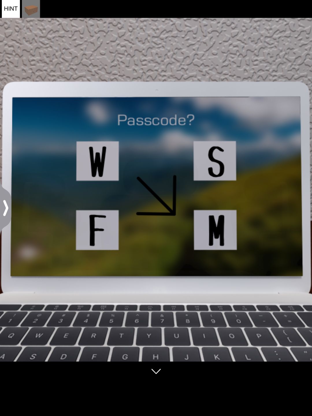 7、将两节电池都装入遥控器中,遥控器亮屏。打开【办公区】的空调。流汗的小猪不热了,打开了电脑,显示需要输入密码。上面的图案和【休息区】棋盘上的图案相似,角度一致时,从右上角开始顺时针记录抱枕的颜色为蓝红绿黄。对应到【白板区】纸张上周一到周日的颜色,可得蓝红绿黄对应Sat,Mon,Fri,Wed,即为SMFW。