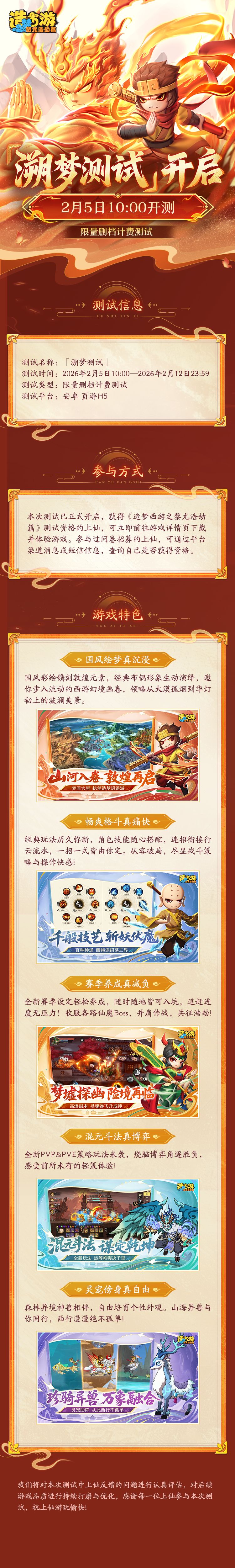 号外号外,有好事发生!《造梦西游之黎尤浩劫篇》「溯梦测试」2026年2月5日10:00正式开启啦!本次为限量删档计费测试,已获取资格的上仙们记得前往详情页下载游戏,随空空一同探索三界吧!点击下方链接,立即查看更多关于本次测试的爆料资讯!