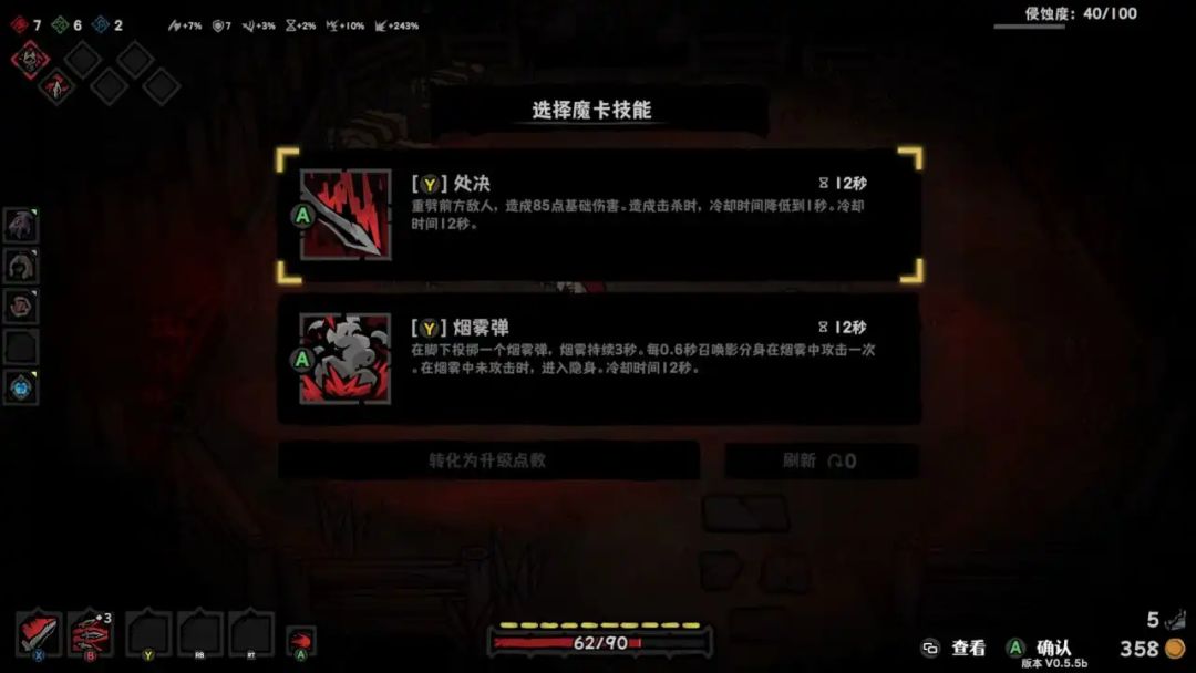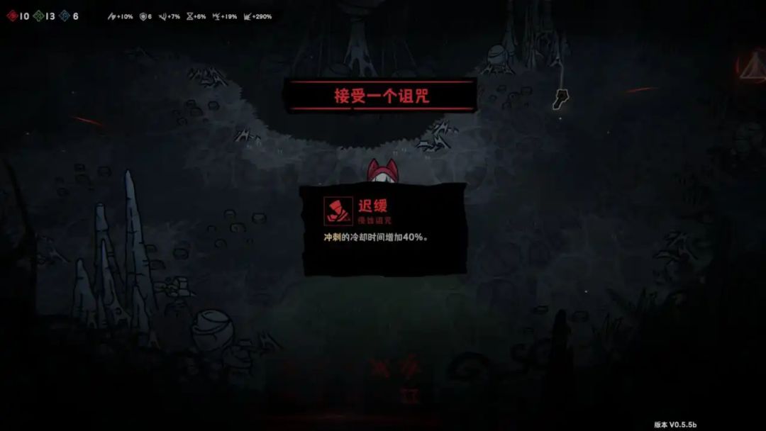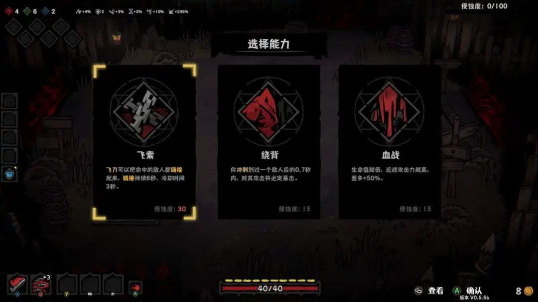药水关卡则能使角色获得新的能力,或是选择强化已有的能力,初始最多6个栏位,要注意的是,很多能力都会有侵蚀值,角色初始能承受的侵蚀数为100点,若是获得的能力超过了限度,则会让角色获得各种诅咒也就是负面buff
