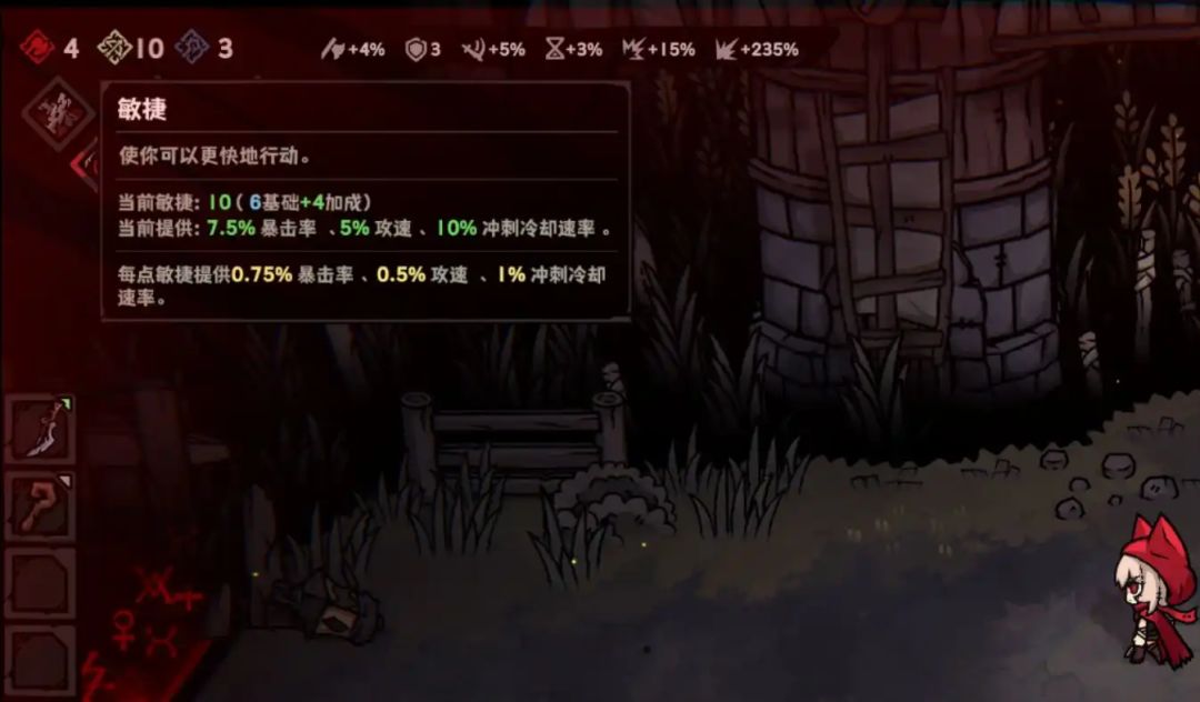 宝箱关卡通关后会获得宝箱,从中能开出各种装备,为角色提供暴击、防御等属性加成以及其他效果,而角色初始拥有5个装备栏位,因此需要根据自己的打法去选择相应的装备,屏幕的左上角会显示当前装备来的属性加成,如暴击率、暴击伤害、防御等