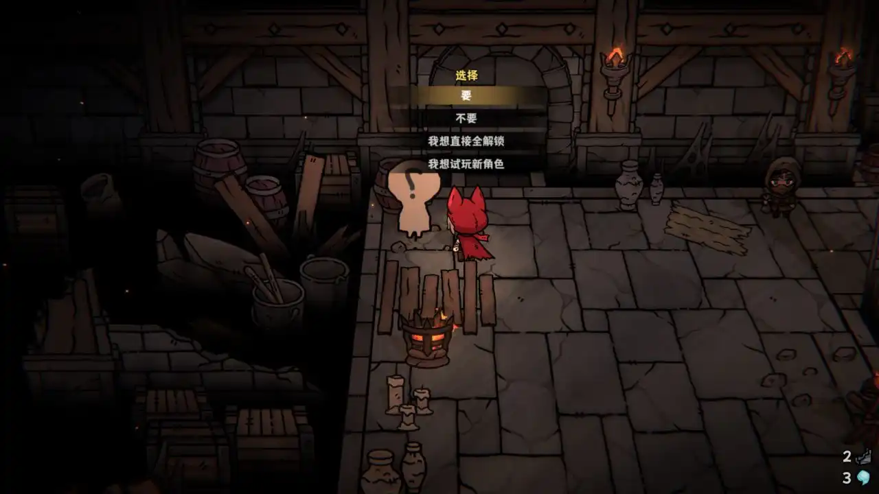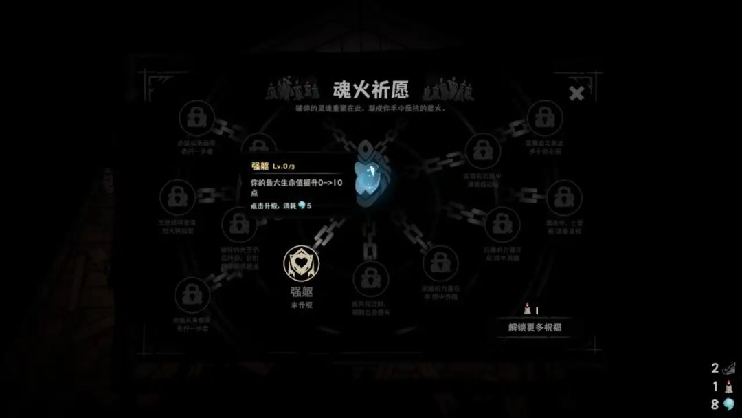 而在我们每次死亡后来的的大本营环节,身边的修女可以为我们提供技能树也就是全局强化,可以通过游玩而获得的材料去解锁和强化。同时在游戏进程中我们会遇到一些被困的npc,把他们解救后也能在大本营为我们提供加成