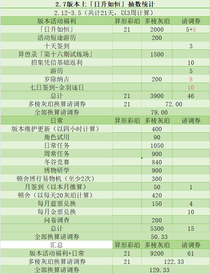 物华弥新2.7版本上「日升如恒」抽数统计