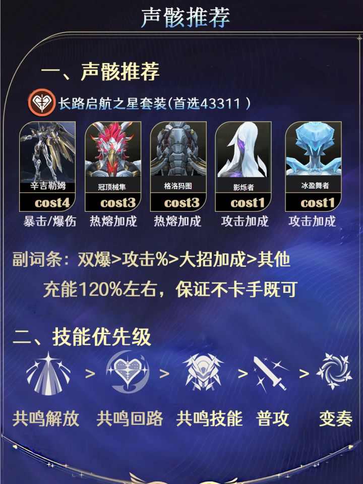 🔸爱弥斯:长路启航之星套装(首选43311),推荐主要声骸辛吉勒姆,主词条cost4选择双爆、cost3选择火伤伤、cost1选择百分比攻击。副词条优先选双爆>攻击%>大招>其他 🔸爱+琳+莫组成3.0谐振毕业队伍 已经抽了琳奈,没有莫宁的朋友也可以上诸如维里奈,守岸人之类的奶妈