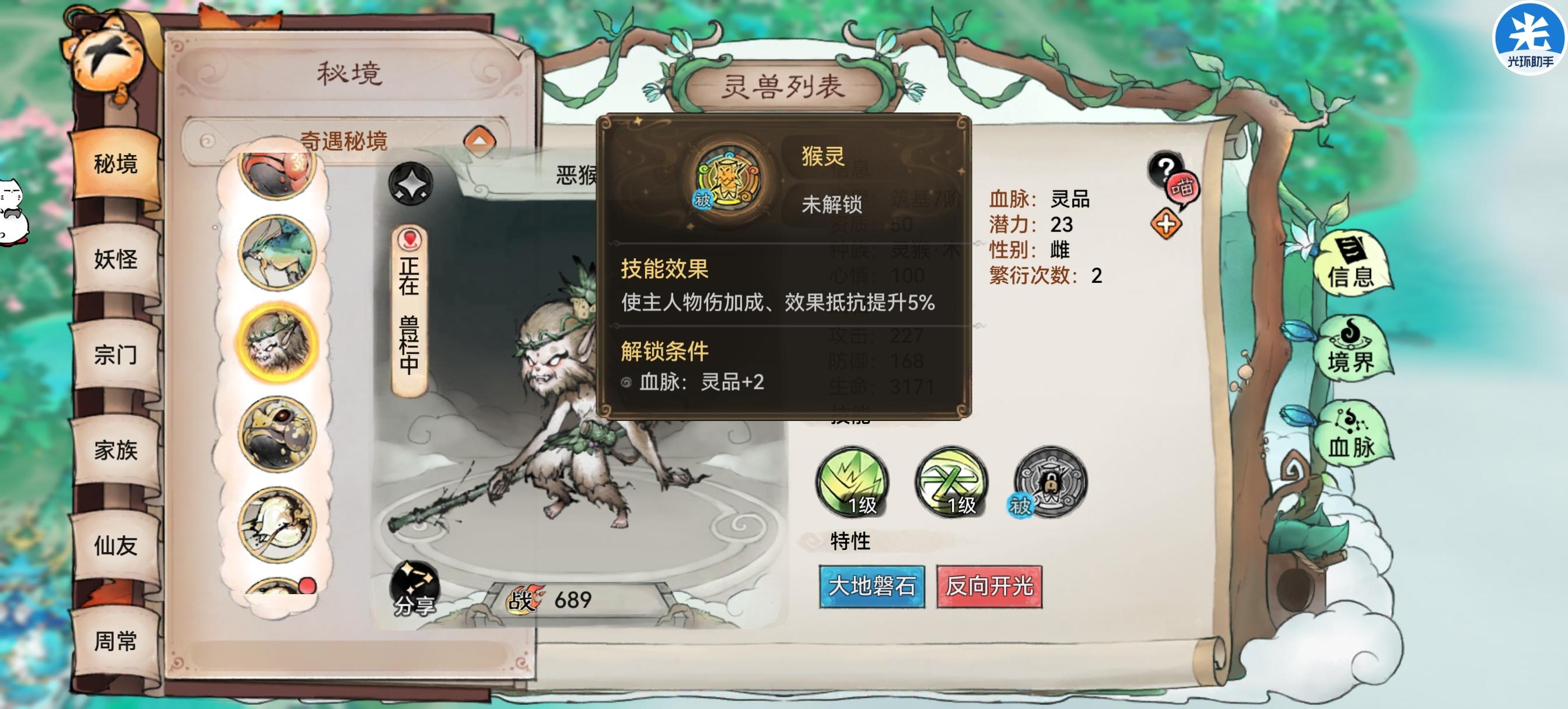 灵猴是典型的输出型灵兽代表。其"闹天宫"系列技能展现出强大的单体爆发能力:对攻击最高的敌方目标造成高额物理伤害并施加晕眩。其中木属性的恶猴还能使目标额外陷入两回合的【法宝封印】,并使自身获得两回合上【伤害提升】。被动技能可使主人获得物伤加成和效果抵抗。