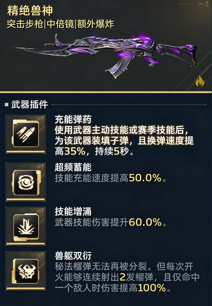 精绝兽神技能榴弹单体伤害非常高,搭配兽躯双衍一次开火发射两枚榴弹,不论刷分打Boss都很强,配上赛季技能充能速度翻倍,[技能连击]+五发榴弹技能伤害直线+75%