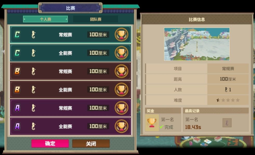 分为个人赛和团队赛,其中常规赛为单纯比拼速度,全能赛为设置障碍物的同时要求速度