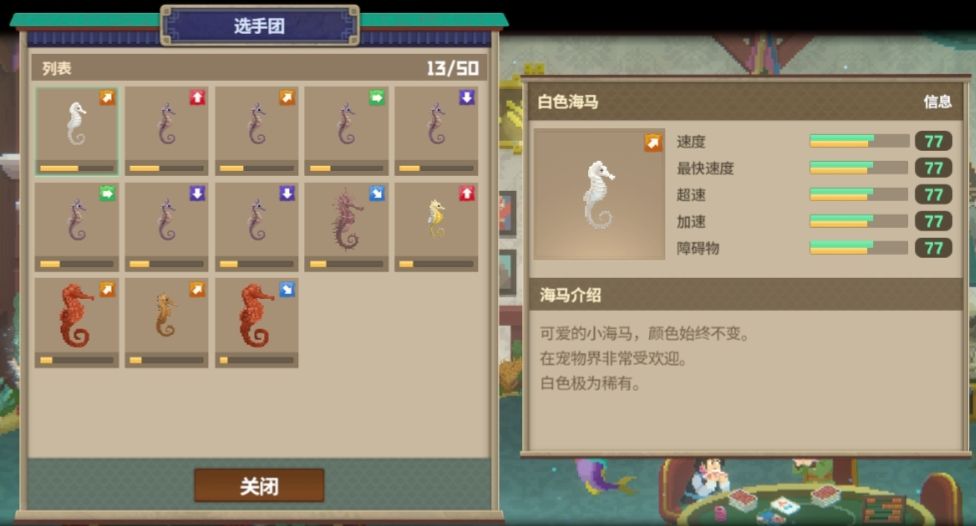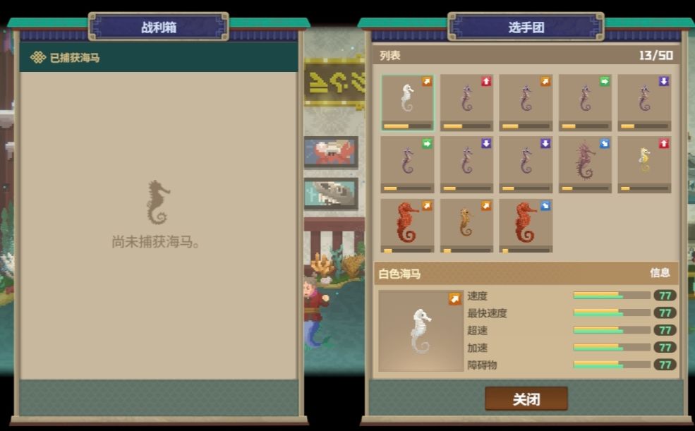 每次下海捕捉的海马选择放入装载箱可以到这里加入选手团,不要的海马也可以在管理中释放