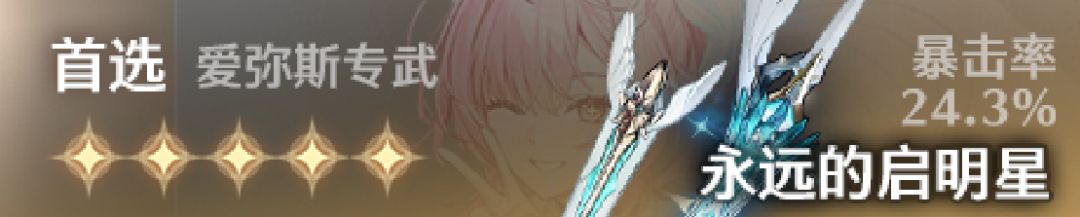 武器:首选专武「永远的启明星」(提供24.3%暴击率),备选为其他五星迅刀(需提供暴击率/暴击伤害属性)。