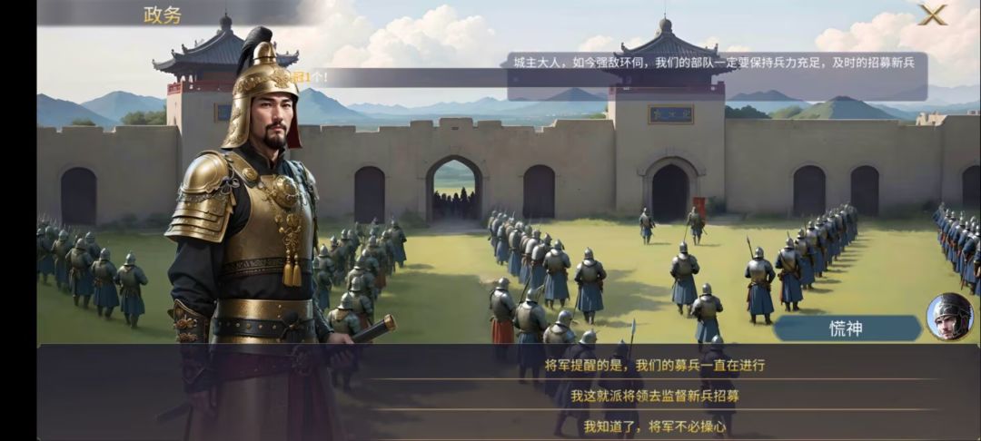 选择:派将领监督新兵招募-再接再厉严格把控,可获得:中级经验书12,中级经验书20、弓兵预备1000、安定值+5