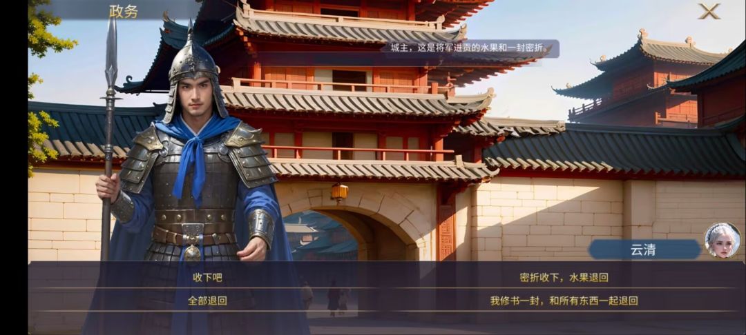 选择:我修书一封,和所有东西一起退回。可获得:中级经验书10、安定值+1,中级经验书20、步兵预备兵2000、安定值+4