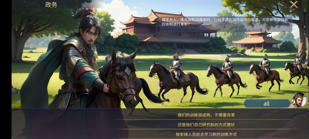 选择:自己研究新方法,第二次选择①照此方式开展训练吧。可获得:中级经验书10,中级经验书10、骑兵500、安定+3;②还是有些欠缺、我进行了补充。可获得:中级经验书10,中级经验书10、骑兵1000、安定+5
