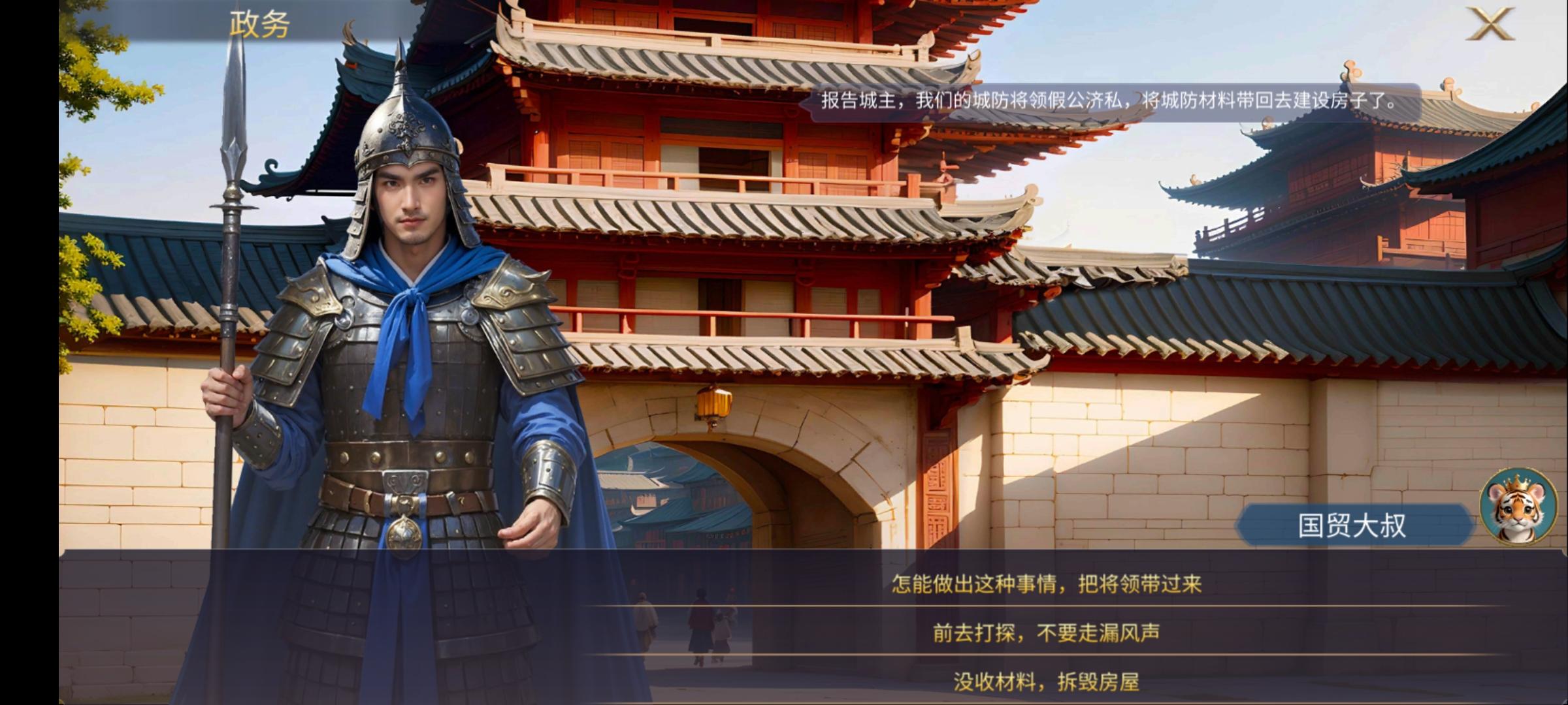 选择:我们的南城居民刚刚被流寇破坏,还是去将房屋修缮吧。可获得:中级经验书5,银币2万、稀有经验书12、安定值+2、繁荣值+2