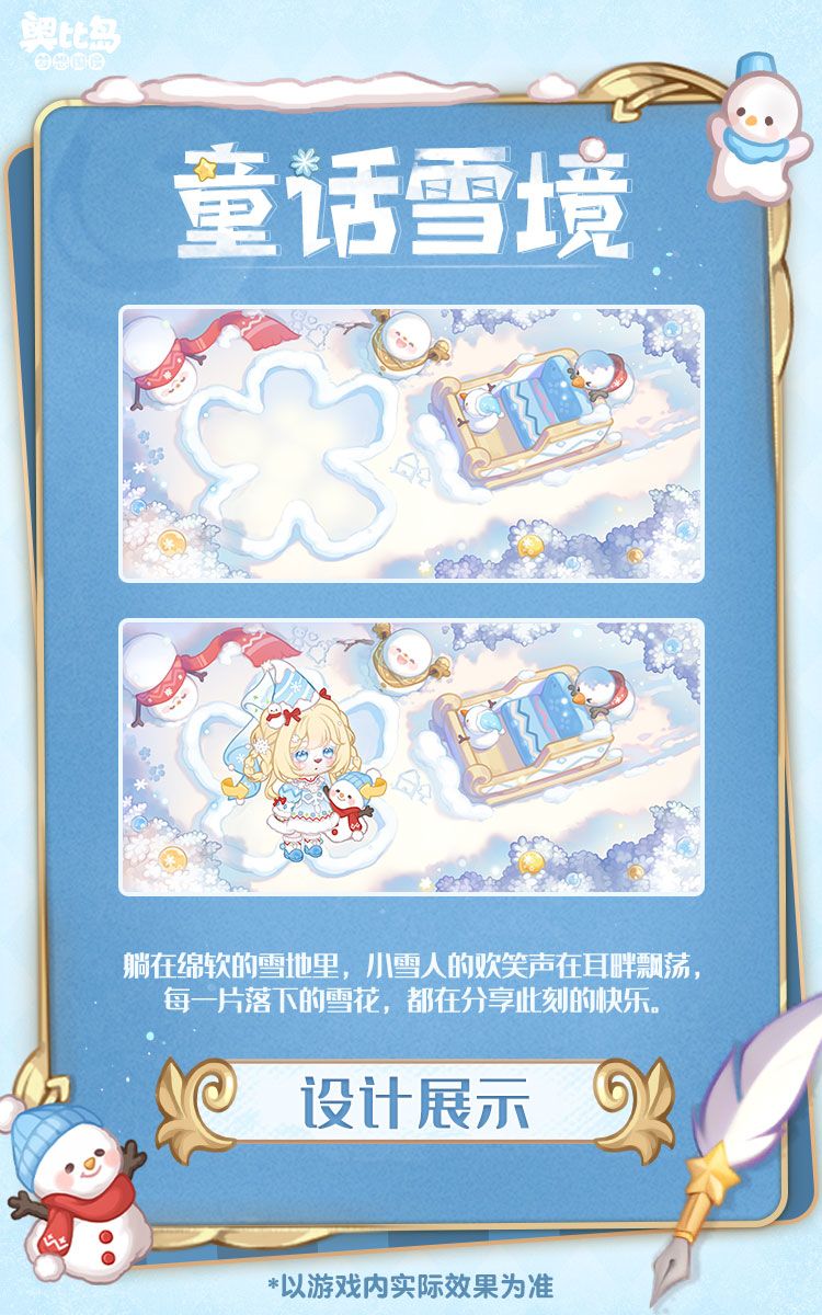 ❄️平凡冬日里,雪娃娃的邀请带来一场绮丽的白雪王国奇遇!乘上雪花凝成的雪橇穿梭林间,任由毛绒衣裙缀满冰晶雪花,那可是冰雪女王施展的奇妙魔法呢!