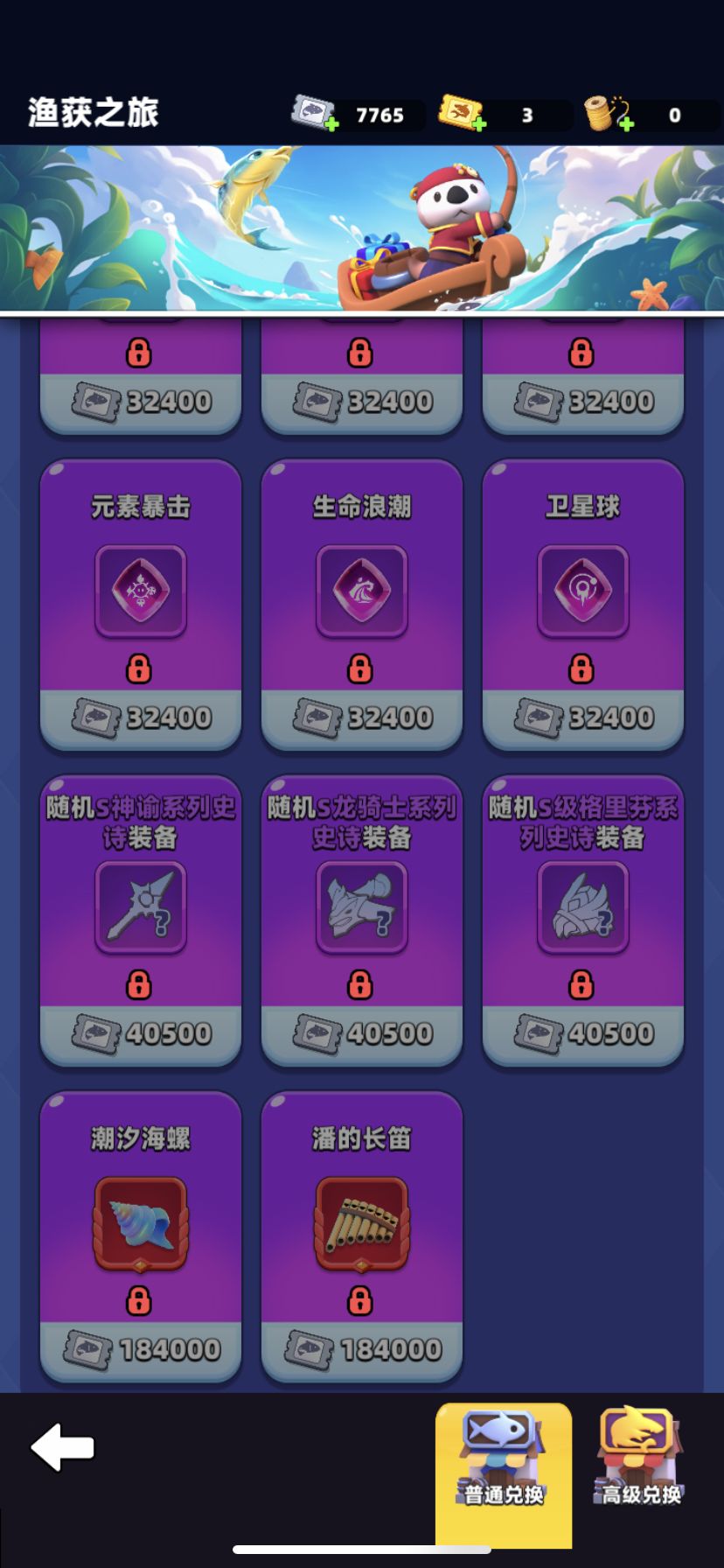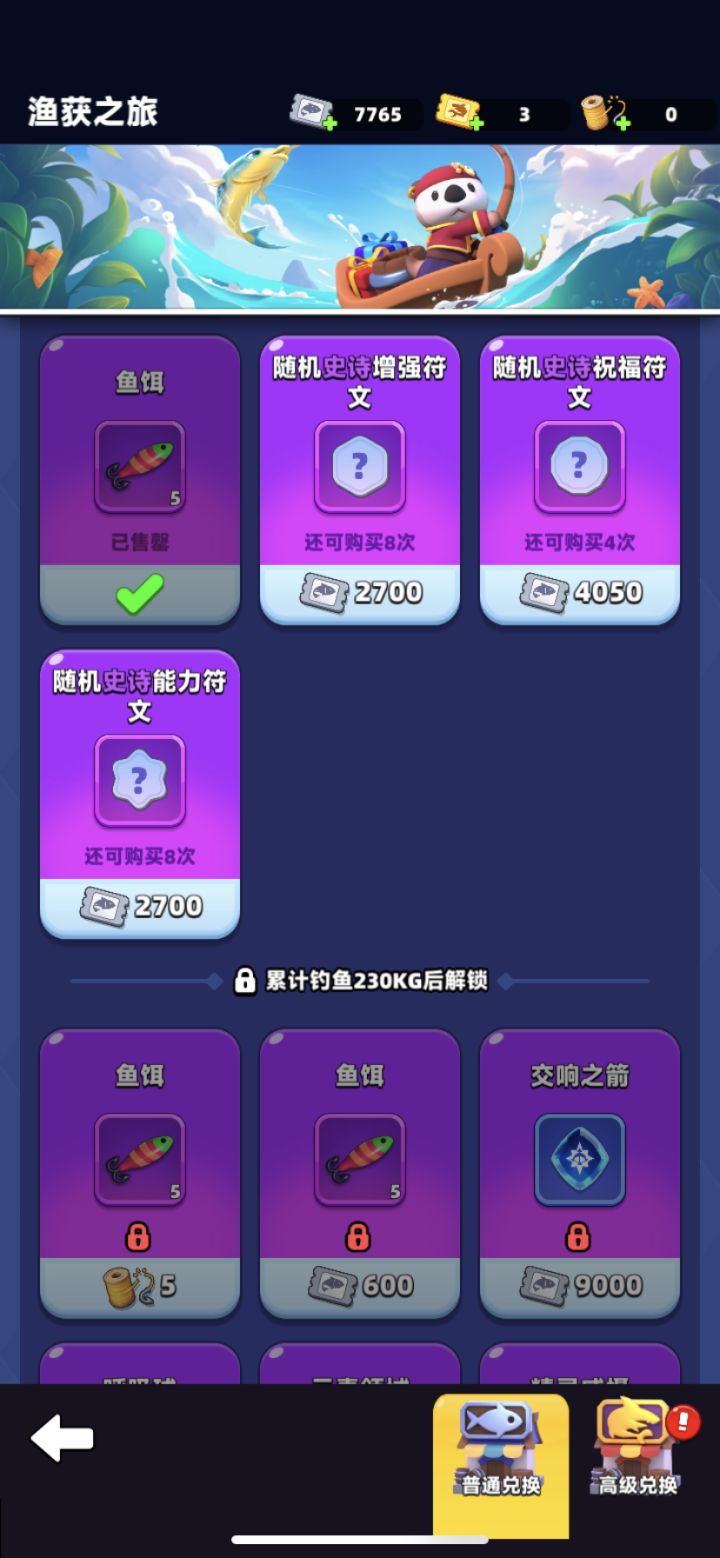 推荐兑换:鱼饵(必须兑换),祝福符文,铭刻符文,幻彩钥匙或s史诗装备。