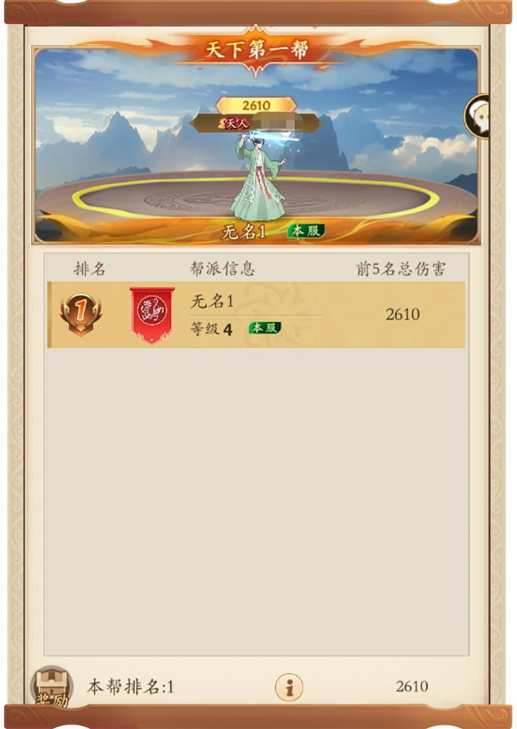 最后还新增了帮派排行榜,帮派排行榜会计算玩家的3个侠客排行榜总伤害,然后取帮派中总伤害前五玩家的伤害总和计算帮派排名;排行榜奖励分为全帮派奖励以及前5名专属奖励。