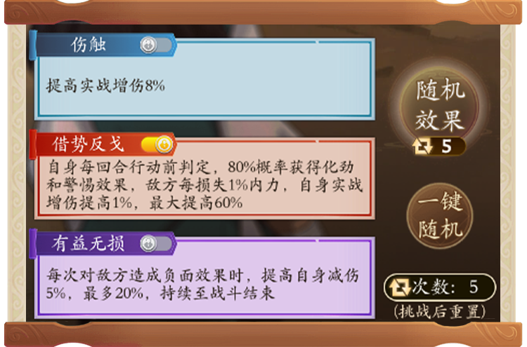 这次还增加了一键随机功能,点击一键随机按钮,开始随机后自动连续刷新buff(已经锁定的buff不受影响),直到刷出红色buff或剩余刷新次数不足后停止(退出界面和掉线也会中断刷新),少侠也能更好地解放双手。