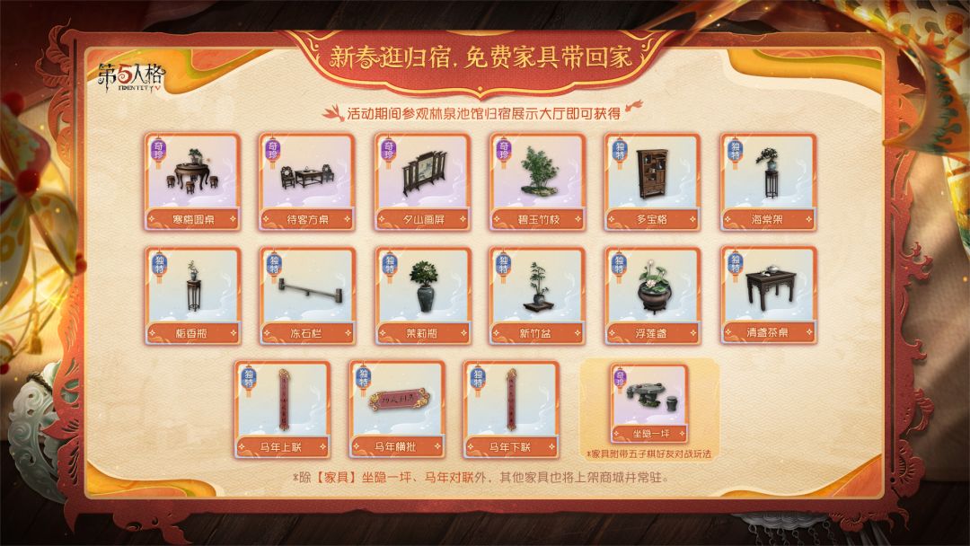 ※ 限时活动:新春逛归宿,免费家具带回家! 林泉池馆的归宿展示大厅将同步开启,可通过活动入口进入参观全新的归宿大厅以及带有节日氛围的家具搭配, 参观后不仅可以获得【奇珍家具】 坐隐一坪(可解锁五子棋好友对战玩法),还可以获得全新商城常驻家具奖励以及独特音符奖励! ※ “林泉池馆”系列家具 满减活动:2月12日维护后——3月4日 在满减活动周期中,使用回声购买“林泉池馆”系列家具,每满1000回声减400回声,满减福利可跟首周折扣共享,将按照首周折扣后的实付金额,叠加进行满减。 最多可享受减12000回声的满减优惠。(满减后,首周综合折扣最低约为4.8折)