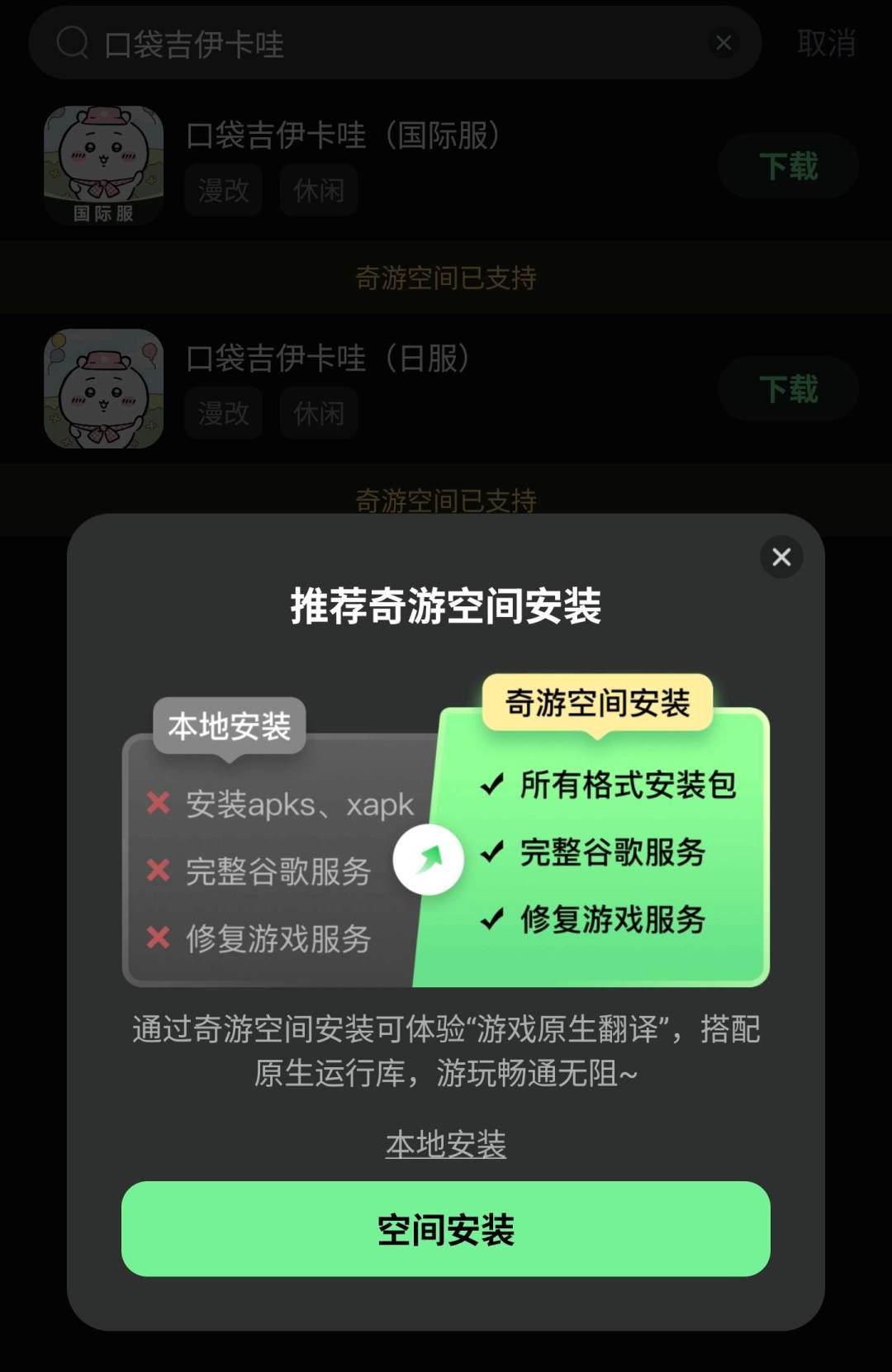 第三步:奇游内搜索【口袋吉伊卡哇】就能下载游戏!(是不是非常简单~)日服与国际服都可以下载哦~