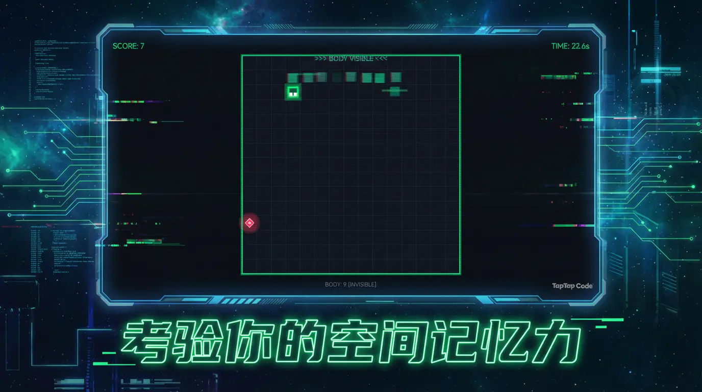 一款考验记忆力的赛博朋克风贪吃蛇游戏。蛇的身体默认完全隐形,只有蛇头和食物可见。当吃到食物时,隐形的身体会以Glitch故障艺术效果短暂显现0.5秒,让你确认当前位置。你需要依靠记忆力避免撞到看不见的自己!全屏滑动操控,霓虹绿配色,CRT扫描线效果,带给你沉浸的赛博朋克体验。