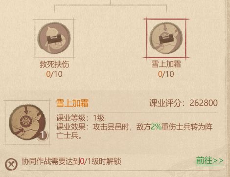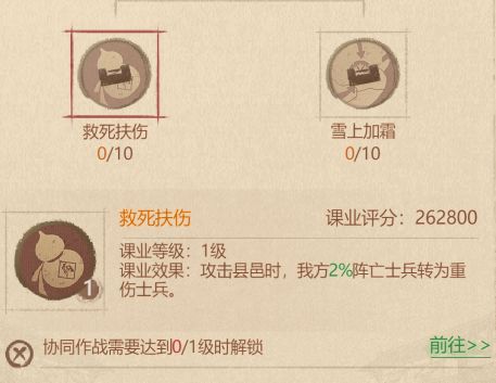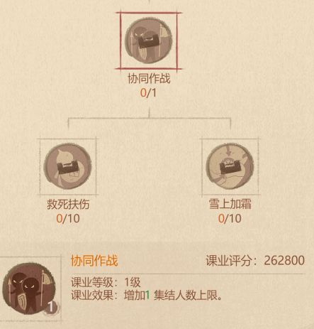 这个课业,经常打架的小伙伴一定不要错过,它可以扩充你的急救营,让你的急救可以存放更多的兵,毕竟急救营满了的话,就要开始死兵了,特别是特种兵对于我们来说还是非常心疼的。下一个课业:协同作战