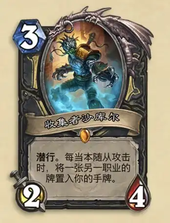 新:潜行。每当本随从攻击时,随机将一张另一职业的牌置入你的手牌。