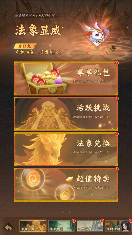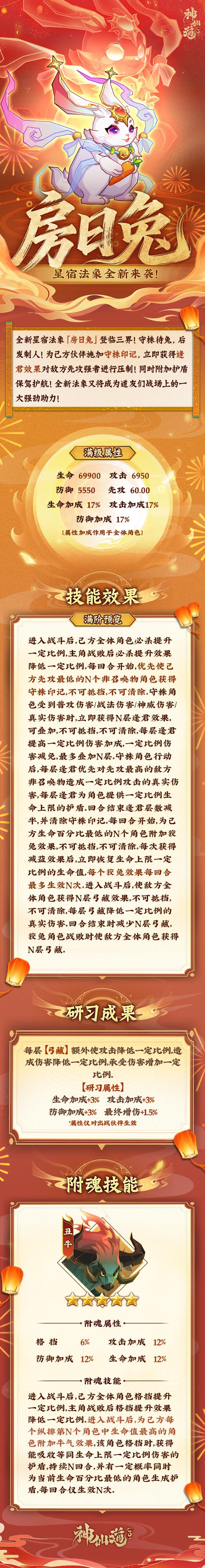全新星宿法象「房日兔」登临三界!守株待兔,后发制人!为己方伙伴施加守株印记,立即获得逢君效果对敌方先攻强者进行压制!同时附加护盾保驾护航!全新法象又将成为道友们战场上的一大强劲助力!
